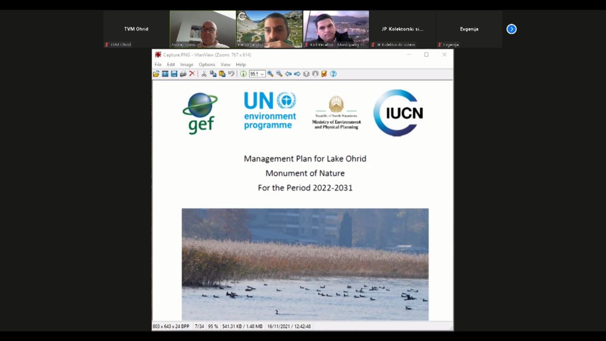 Денес преку Zoom платформата се одржа консултативна работилница со засегнатите страни по Нацрт планот за управување со Споменикот на природата на Охридското Езеро. Овој документ е подготвен во рамките на проектот „Постигнување на зачувување на биолошката разновидност преку создавање и ефективно управување со заштитените подрачја во планирање за користење на земјиштето“, со експертска поддршка од Меѓународната унија за заштита на природата. Целта на работилницата е да обезбеди пошироко вклучување на засегнатите страни, да се добие препораки и коментари за предлогот и да се обезбеди добар квалитет и применливост на документот.