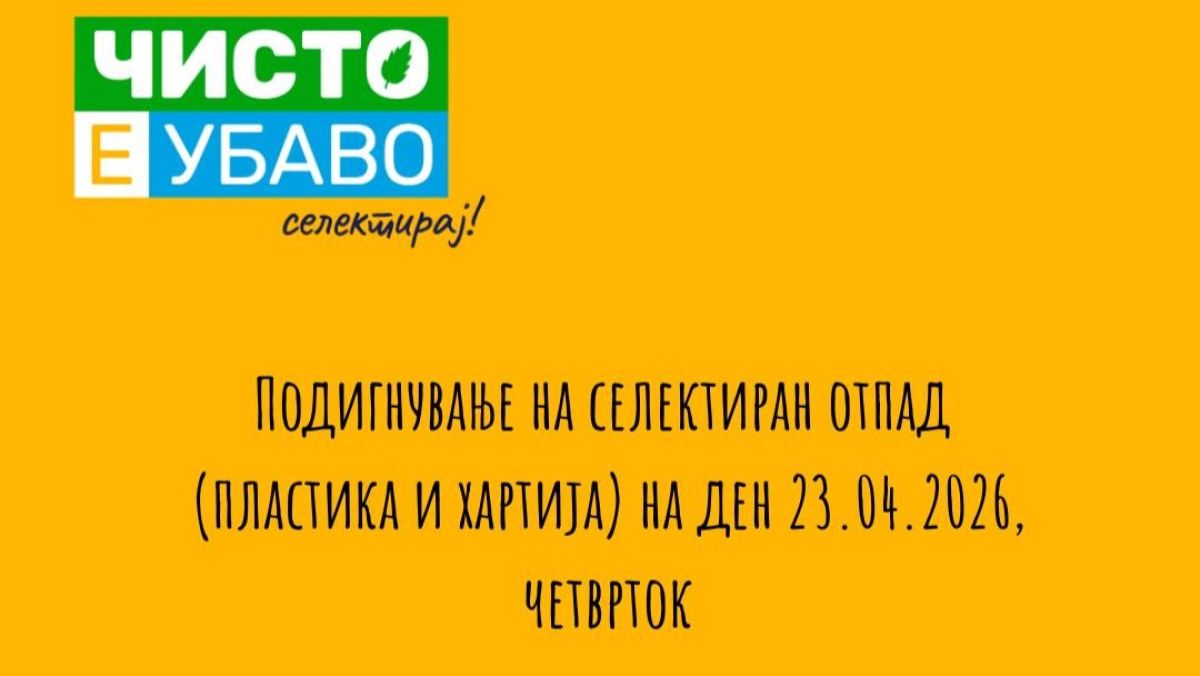 Согласно измените во Календарот за 2026 год. за подигнување отпад од пластика и хартија од кантите за селекција, Ј.П.,,Охридски Kомуналец” ги потсетува своите корисници на услуги од улиците ,,Железничка” , ,,Прилепска” , ,,Винковачка” , ,,Будва“, ,,Крали Марко” и ,,8-ми Март” дека на ден 23.04.2026 год. (четврток) ќе врши подигнување на отпад од пластика (жолти садови) и хартија и картон (сини садови) од кантите за селекција.