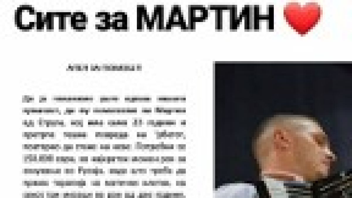 На 23 годишниот Мартин од Струга потребна му е помош од сите хумани луѓе. Поради повреда на рбетниот мозок, на Мартин потребно му е лекување со матични клетки во Русија, третман кој трае две години, на секои три месеци.