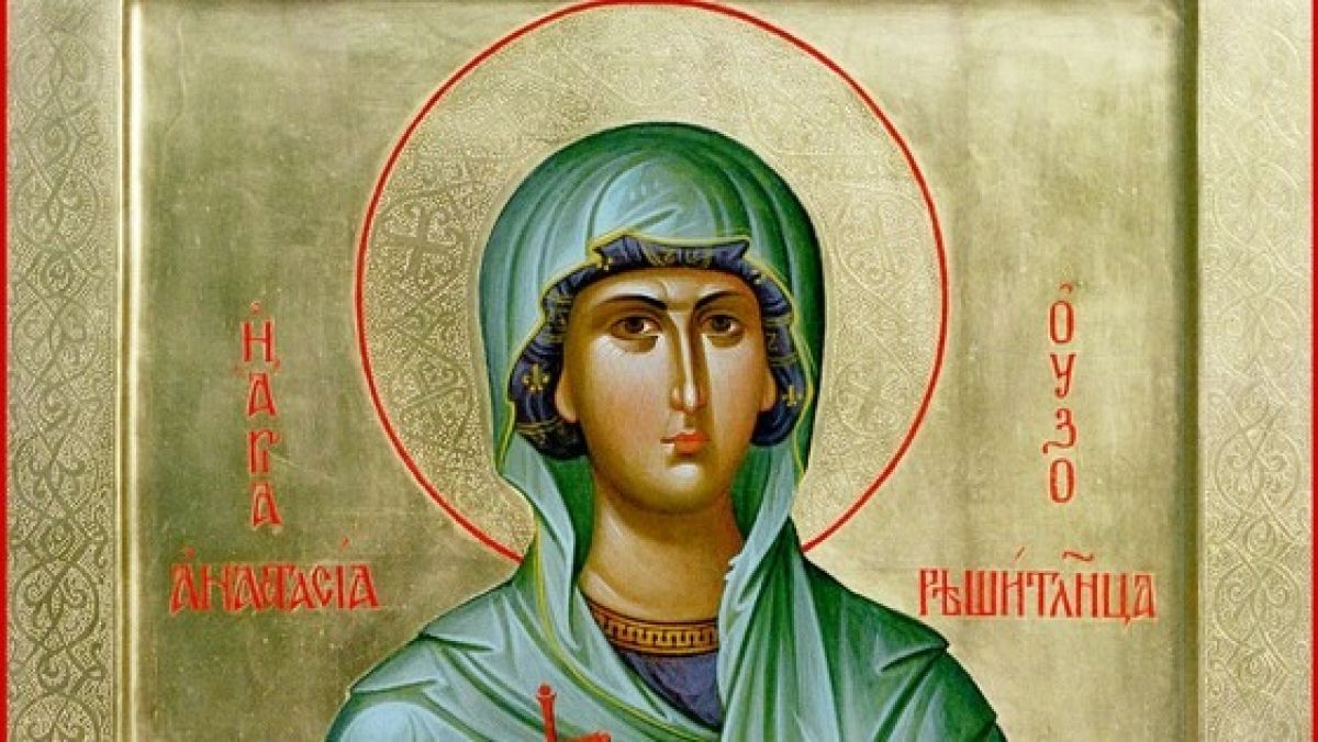 Оваа славна ревнителка на Христовата вера се роди во Рим, во дом богат и сенаторски, од татко паганин и мајка христијанка. Уште како млада се приврза со љубов кон Господа Исуса, а во Христовата наука ја раководеше благочестивиот учител Хрисогон. Принудена од татко ѝ, стапи во брак со некој незнабожечки велепоседник Публиј. Под изговор на женски болести, никако не сакаше да влезе со него во телесна врска. За ова мажот ѝ горчливо ја мачеше со затвор и глад. А уште поголеми маки ѝ наложи кога дозна дека таа тајно ги посетува христијанските маченици по затворите, им носи понадици, ги служи, им ги мие раните, им ги одврзува јажињата (заради што е наречена Узорешителница, односно онаа која ги одврзува јажињата). По Божја Промисла беше ослободена од свирепиот маж – царот го испрати Публиј во Персија, а тој патувајќи по морето потона. Тогаш светата Анастасија почна слободно да им служи на мачените христијани и своето големо наследство да го троши делејќи им милостина на сиромасите. Еднаш, царот Диоклецијан беше во градот Аквилеја и нареди да му го доведат Христовиот исповедник Хрисогон. Него по патот го придружуваше света Анастасија. На заповед од царот, на светиот Хрисогон му ја отсекоа главата. Тогаш пострадаа и трите сестри Агапија, Хионија и Ирина (под 16 април): првите две беа фрлени во оган, а третата прострелана со стрела. Нивните тела ги зеде светата Анастасија, ги завитка во бело платно и откако ги обложи со многу аромати чесно ги погреба. Потоа отиде во Македонија и таму им помагаше на Христовите страдалници. Овде ја препознаа како христијанка, и заради тоа ја фатија и ја водеа на сослушување и мачење кај разни судии. Сакајќи да умре за возљубениот Христос, Анастасија непрестајно во срцето ревнуваше кон Него. Еден началник на жреците Улпијан сакаше сладострасно да ја оскверни, но одеднаш ослепе и издивна. Осудена на смрт со глад, света Анастасија прележа во затворот триесет дена без храна, хранејќи се единствено со солзи и молитва. Потоа ја ставија на кораб со уште неколкумина христијани за сите да ги потопат, но Бог ја сочува и од таа смрт. Најпосле ја положија над оган, да виси приврзана со рацете и нозете со четири јазли, па ја предаде својата света душа на Бога. Пострада и премина во Христовото Царство во 304 година.