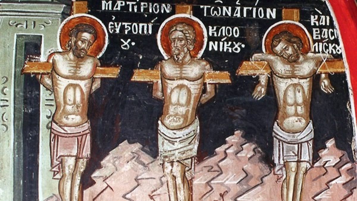 Му беа другари на светиот Теодор Тирон. Кога славниот Теодор славно и умре, тие останаа во затворот после него и уште долго не беа осудени, зашто се обавуваше смената на царскиот намесник во градот Амесија. Кога стигна новиот намесник, уште понечовечен од својот претходник, нареди и му ги изведоа овие тројца. Сите беа млади, Клеоник и Евтропиј беа родени браќа, а Василиск му беше роднина на свети Теодор. Но, според братската љубов меѓу нив како да беа тројцата браќа. Така му рекоа и на намесникот: „Како што Светата Троица е неделива така и ние сме неделиви во верата и неразлачни во љубовта“. Сите ласкања на намесникот и сите обиди да го поткупи Евтропиј беа залудни. Тој прво го покани Евтропиј на вечера, но Евтропиј го одби со зборовите на Псалмот: „Блажен е оној човек кој не оди на совет безбожнички“ (Пс. 1,1). Потоа намесникот му понуди и огромно богатство – сто и педесет литри сребро – но Евтропиј и за ова го одби потсетувајќи го дека Јуда за сребро си ја изгуби душата. После сите обиди, малтретирања и мачења, Евтропиј и Клеоник беа осудени на смрт со распетие, а Василиск го убија со меч. Му благодареа на Бога Којшто ги удостои да заминат во радоста на Неговото Царство, во кое му тргнаа во пресрет на својот војвода свети Теодор, прославен од Христа, Господ и Победникот. Чесно пострадаа во 308 година.
