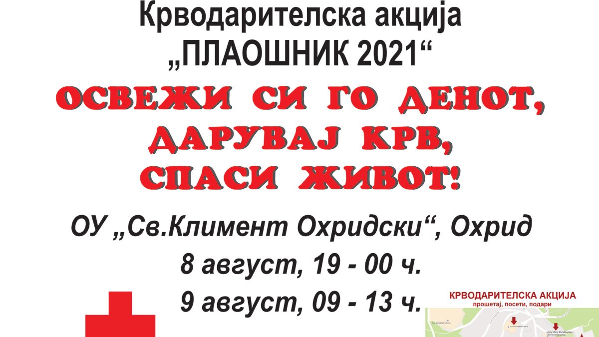 Традиционалната крводарителска акција која во организација на Црвен крст Охрид секоја година се одржува за празникот Св.Климент и оваа година ќе се реализира во спортската сала на ОУ „Св.Климент Охридски“ во Охрид и тоа на 8 август (недела) во периодот од 19-24 ч. и на  9 август (понеделник) во периодот од 9-13 ч.