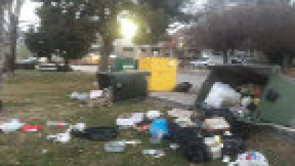 Не поминаа неколку месеци откако се поставени новите садови за ситен отпад со модерен дизајн, викенддов речиси сите се откорнати и оштетени по градскиот кеј и по ул.„Македонски Просветители„. Исто така контејнерите по ул.„Кеј Македонија„ , „АСНОМ„ , „Булевар Туристичка“, „Егејска“, „7-ми Ноември“ и „Македонски Просветители“ се превртени, а ѓубрето останало расфрлано по коловозот, тревните површини и пешачките патеки.