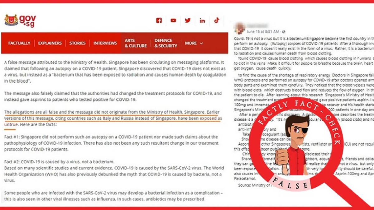 Невистинит е овој  пост во којшто се тврди дека Сингапур открил оти ковид-19 е предизвикан од бактерија, а не од вирус, како и тоа дека ја променил терапијата за лекување. Исто така, не е точно дека обдукцијата била извршена спротивно на протоколите и насоките од СЗО, затоа што СЗО не ги забранува обдукциите на починатите од ковид. Ковид-19 е предизвикан од вирус, а не од бактерија и ова е третото лажно тврдење во постот. Фактот што овие дезинформации им се атрибуираат на официјални медицински власти на Сингапур, покажува колку пропагандата и машината за лажни информации не води сметка за јавното здравје и нема скрупули кога станува збор за тоа како ќе ѝ даде поголем кредибилитет на својата дезинформациска агенда