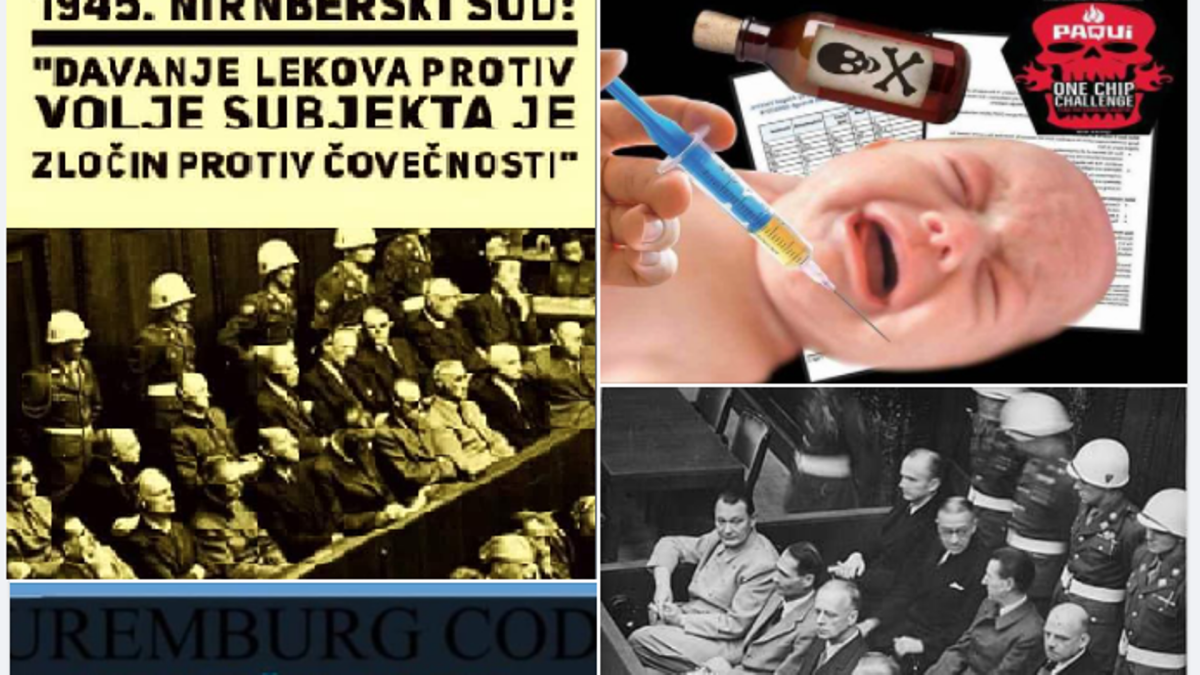 Колаж од шест фотографии се кристи во објава на социјалната мрежа Фејсбук за злоупотреба на Нирнбершкиот процес во функција на антиваксерска камапња.