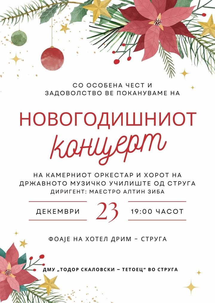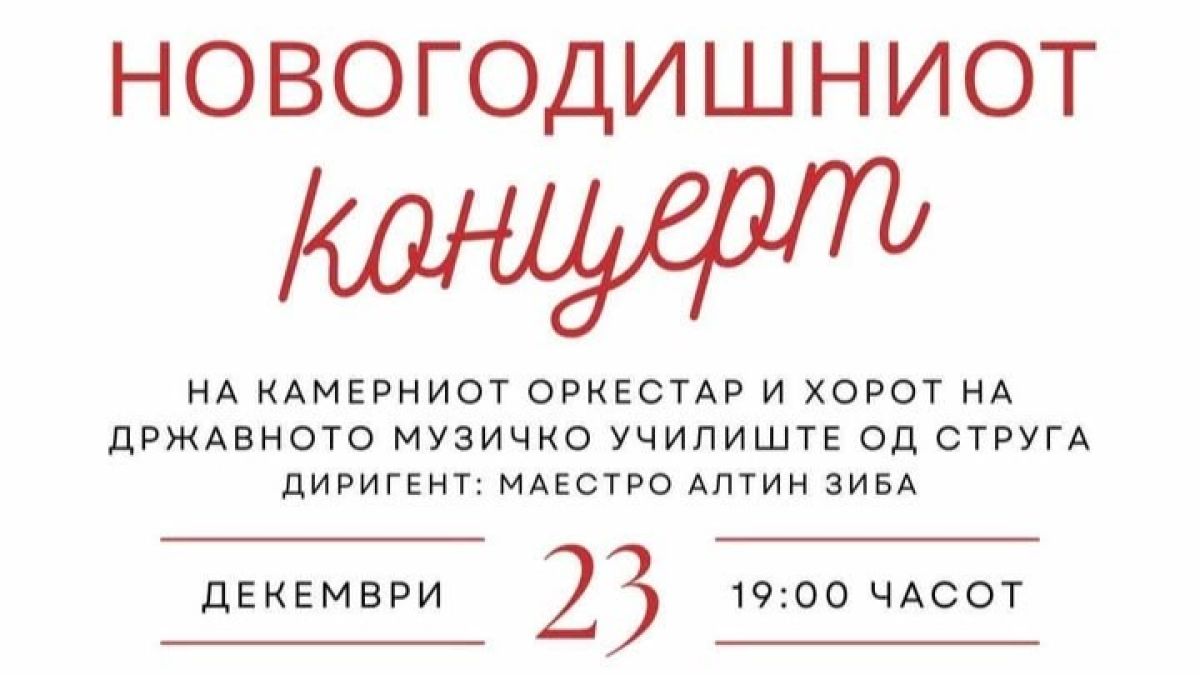 Вечерва во 19 часот во хотел Дрим во Струга ќе се одржи Новогодишен концерт на Средното музичко училиште „Тодор Скаловски- Тетоец”, дисперзирани паралелки Струга.