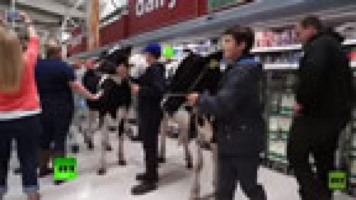 Западната политика на антируски санкции и контрасанкциите од Русија е стратегија во која сите губат, а некои британски земјоделци се одлучиле на искажување на незадоволство со нов вид на протести. Имено, во трговскиот центар Asda дошле со крави.