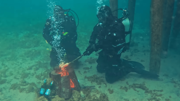 Традиционално и на уникатен начин нуркачите од „Амфора“ кај Музејот на вода ја прославија Православна Нова година со оган и на кој печеа колбаси под вода.