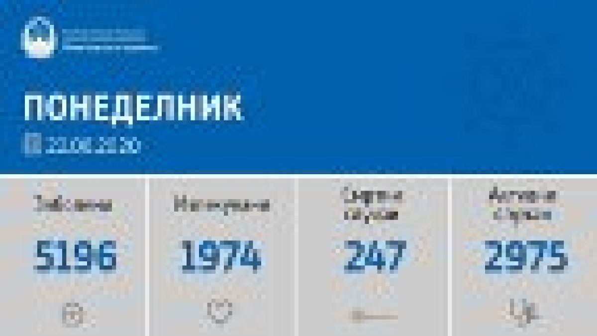 Досега во земјата се направени вкупно 51.885 тестирања на ковид -19. Нема тестирања во рамките на скринингот. Вкупната бројка на ковид дијагностицирани во нашата земја од почетокот на епидемијата изнесува 5196, бројката на оздравени пациенти е 1974, на починати е 247 а во моментов бројот на активни случаи во земјата изнесува 2975.