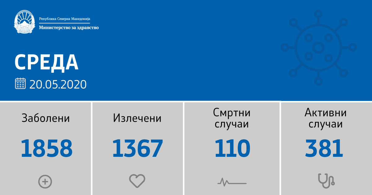 Вкупната бројка на ковид дијагностицирани во нашата земја од почетокот на епидемијата изнесува 1858, бројката на оздравени пациенти е 1367, на починати е 110, а во моментов бројот на активни случаи во земјата изнесува 381.