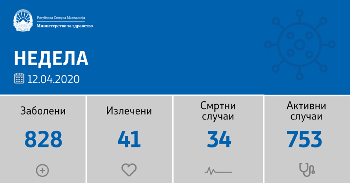 Вкупната бројка на дијагностицирани пациенти со Ковид-19 во нашата земја изнесува 828 лица. Во изминатото деноноќие направени се 404 теста, а досега направени се вкупно 8.057 тестирања на коронавирус.