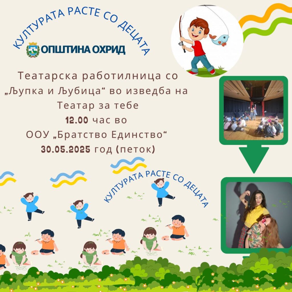 Во рамки на проектот на Општина Охрид Културата расте со децата „За сите деца“, денес ќе се одржи театарската работилница „Љупка и Љубица“.