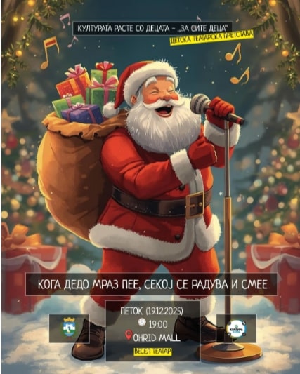 Денес од 19 часот во Охрид Мол најмладите ќе уживаат во детската театарска претстава „КОГА ДЕДО МРАЗ ПЕЕ, СЕКОЈ СЕ РАДУВА И СМЕЕ” во изведба на „Весел театар“.