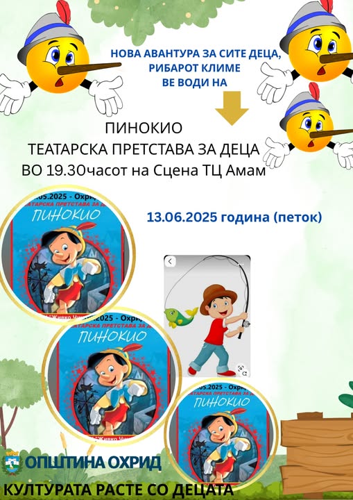 Kако дел од програмата на Општина Охрид „Културата расте со децата“, вечерва на сцената „ТЦ Амам“ ќе биде изведена детската театарска претстава „Пинокио“ во изведба на Балада продукција.