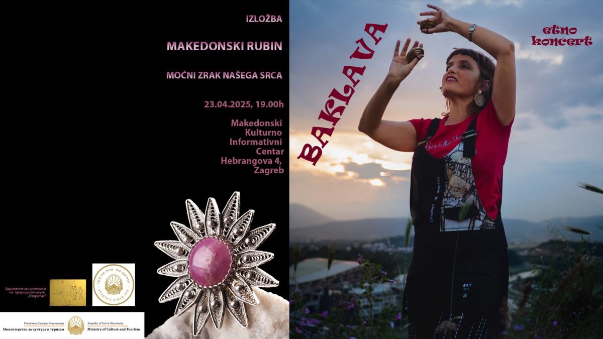 Во македонскиот Културно информативен центар во Загреб утре, среда, 23-ти април загребската публика ќе има ексклузивна можност да проследи уникатен мултимедијален културен настан во рамките на кој ќе биде отворена изложбата „Македонскиот рубин – моќниот зрак на нашето срце“ и ќе биде одржан етно концерт на групата „Баклава“.