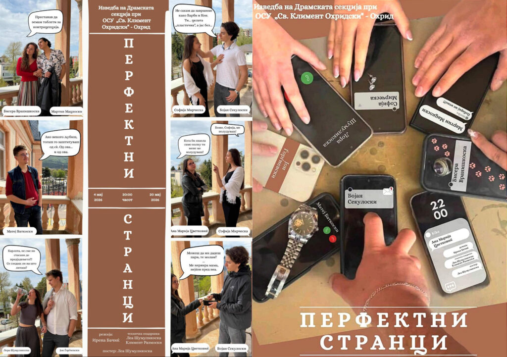 Во понеделник, 4-ти мај, во 20:00 часот во НУЦК „Григор Прличев“ – Охрид, драмската секција при ОСУ „Св. Климент Охридски” ќе ја изведе нивната најнова претстава „Перфектни странци“, претстава која како што велат ќе ве насмее, ќе ве затегне, и ќе ве натера да го погледнете сопствениот телефон поинаку.