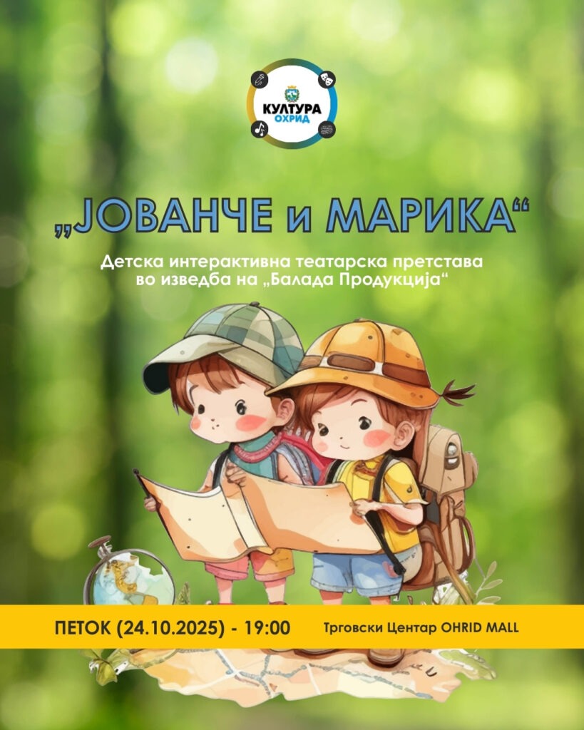 Во рамки на проектот на Општина Охрид, Културата расте со децата „За сите деца“, овој петок ќе се одржи детската интерактивна претстава „Јованче и Марика“ во изведба на „Балада продукција“.