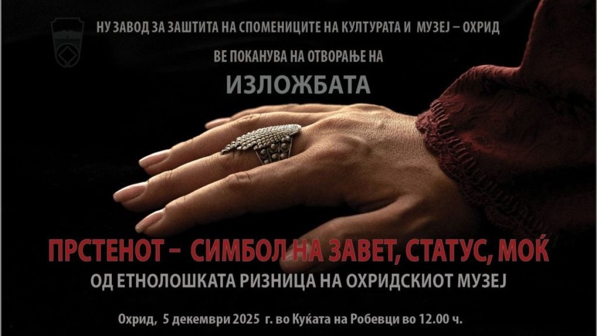 Во петок, 5 декември 2025 година во 12 часот во Куќата на Робевци ќе биде отворена изложбата „Прстенот – симбол на завет, статус, моќ – од етнолошката ризница на охридскиот музеј“.