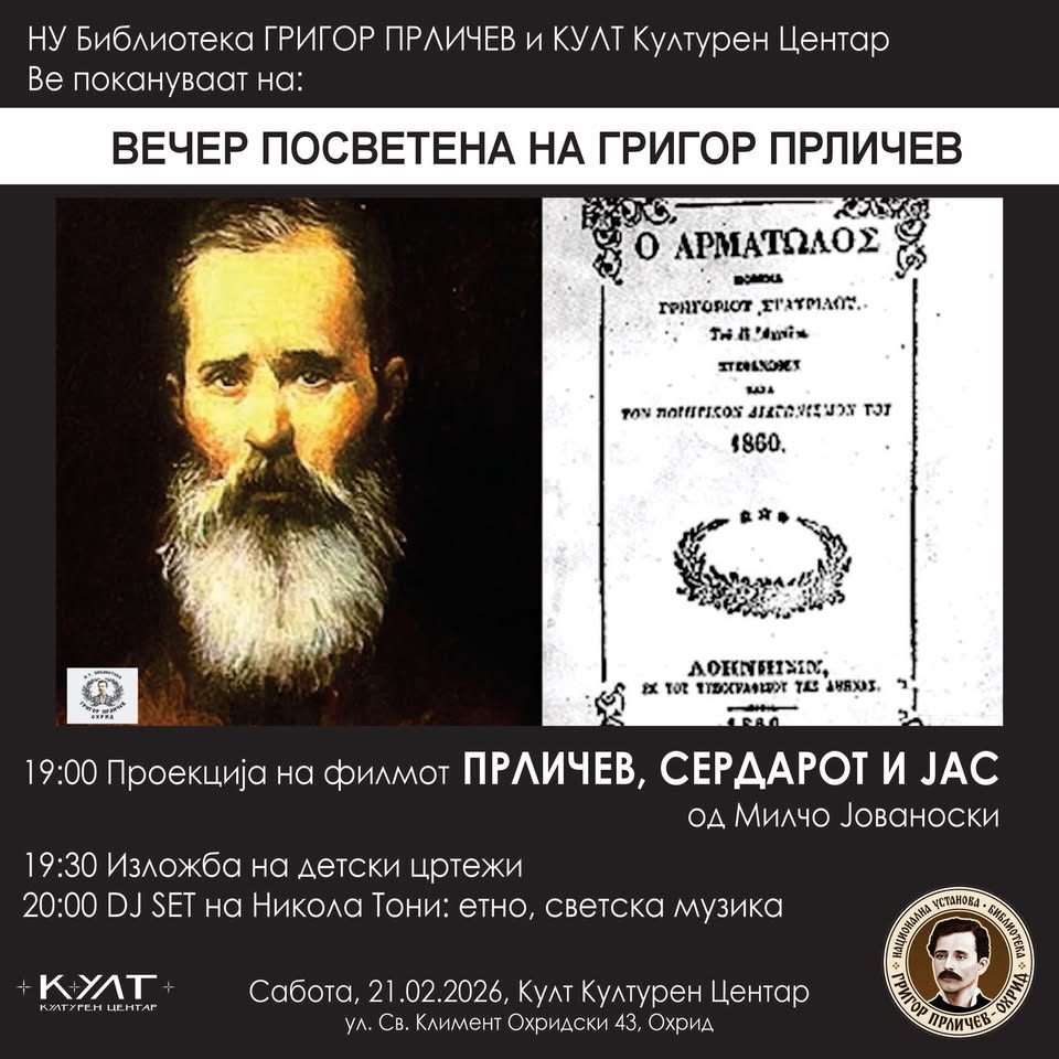 Во сабота, 21 февруари, со почеток во 19 часот во Култ Културен Центар ќе биде прикажан филмот „Прличев, Сердарот и јас“ во авторство на Милчо Јованоски, а во продукција на НУ Библиотека Григор Прличев.