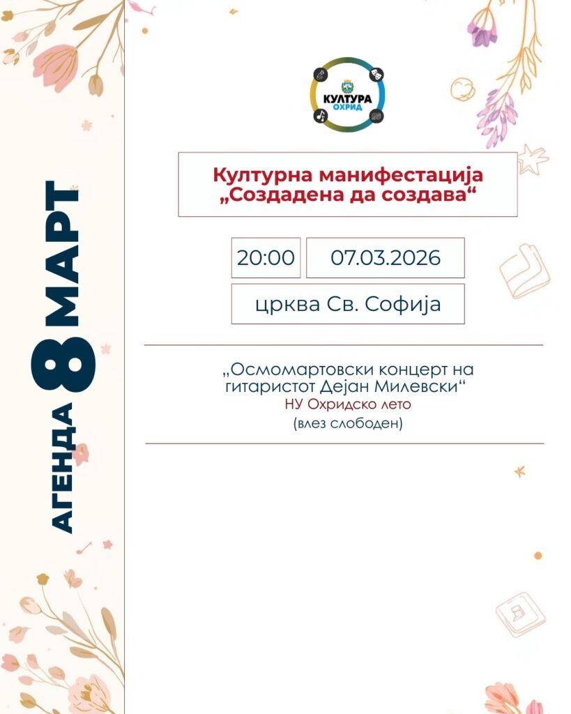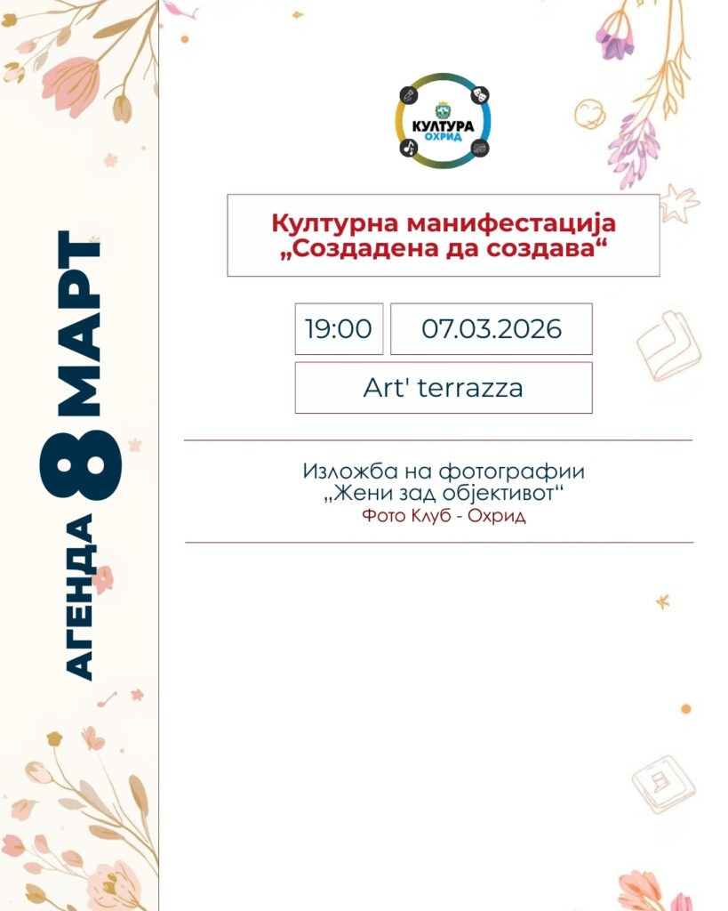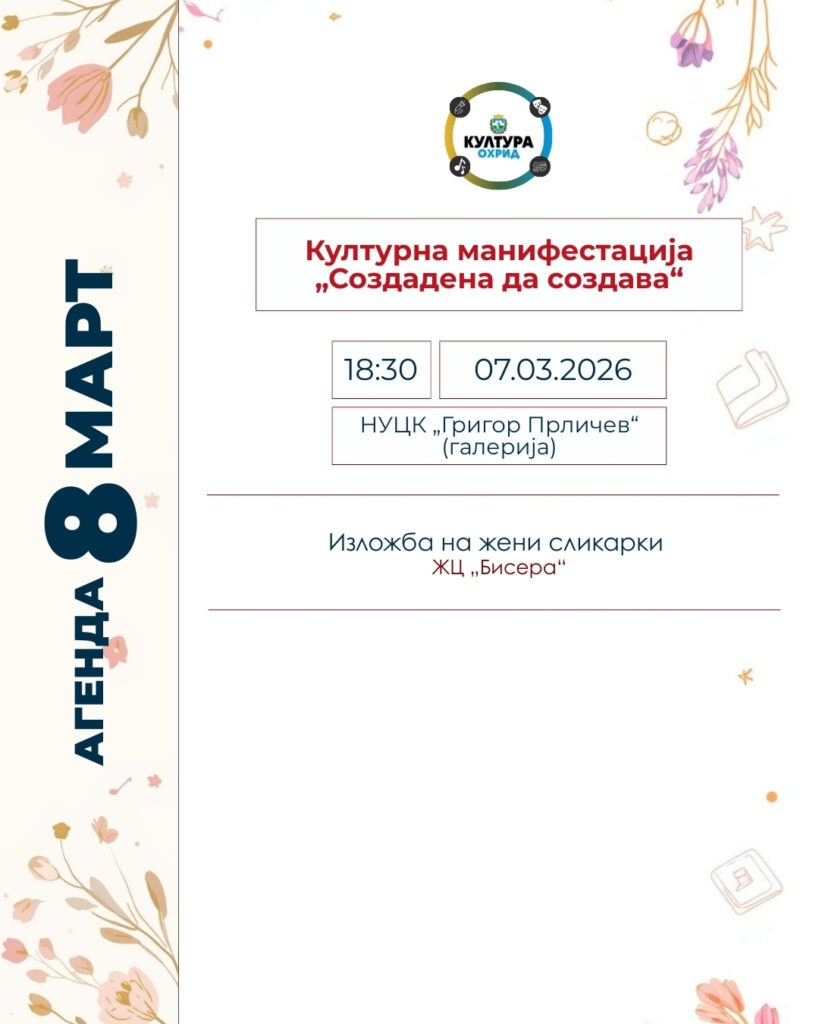 Со културната манифестација „Создадена да создава“ ќе биде одбележан 8 Март во Охрид. Настанот е во организација на Општина Охрид, НУ Охридско лето, Женски Центар „Бисера“ – Охрид и Фото Клуб- Охрид.