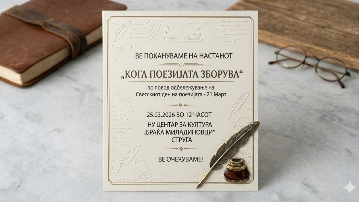 Денес во организација на Центарот за култура „Браќа Миладиновци“ – Струга со почеток во 12 часот, во фоајето на Центарот ќе се одржи свеченост „Кога поезијата зборува“ по повод одбележувањето на 21 Март – Светскиот ден на поезијата.