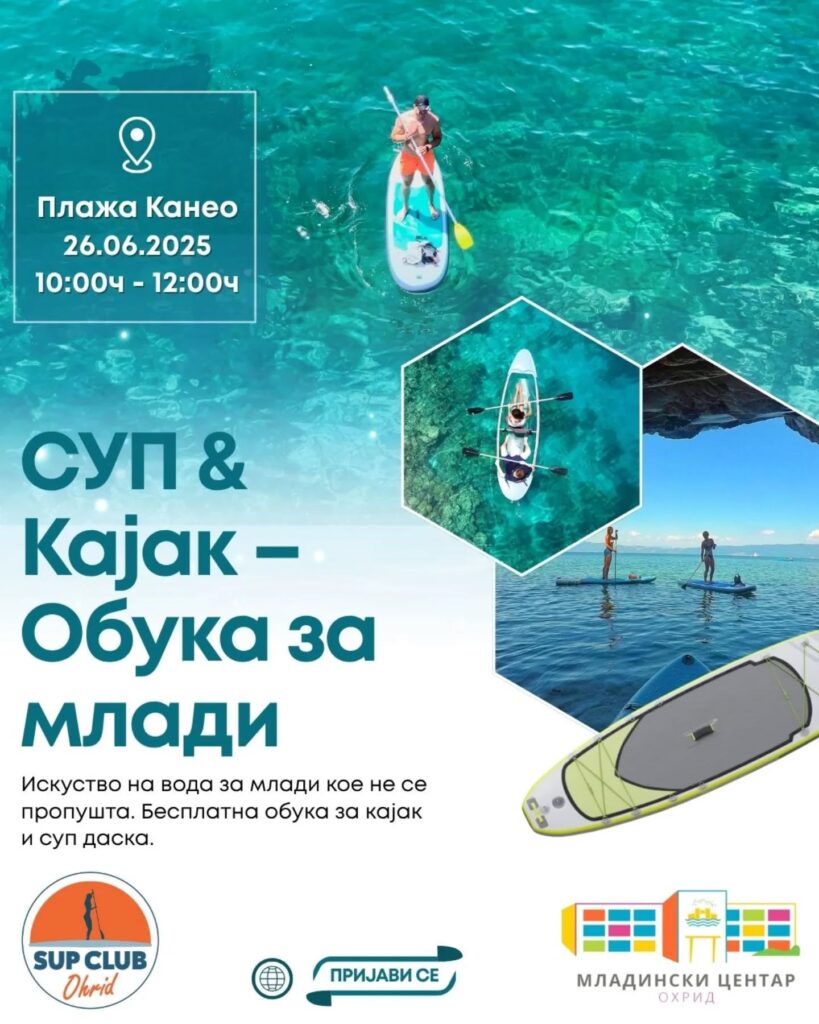 Младински Центар Охрид и СУП Клубот Охрид организираат бесплатни обуки за кајак и суп даска.