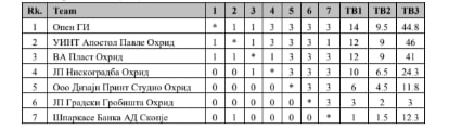 Во Бизнис лигата во шах учествуваа 7 екипи: „Опен ГИ“ Охрид, „ВА Пласт“ Охрид, ЈП „Нискоградба“ Охрид, ЈП „Градски гробишта“ Охрид, Шпаркасе Банка АД Скопје, ООО „Дизајн Принт Студио“ Охрид и УИТ „Апостол Павле“ Охрид.